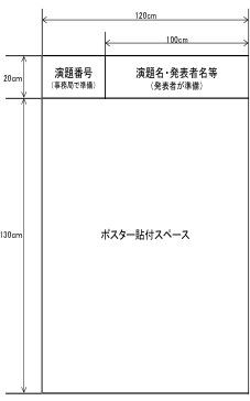 - ポスターボードの大きさは、横120cm×縦150cmです。ポスターボードの上部に演題番号と演題名等を表示するスペースがあります。演題番号は事務局で用意いたします。演題名等を表示するスペースは横100cm×縦20cmです。演題名等は発表者が準備のうえ持参してください。